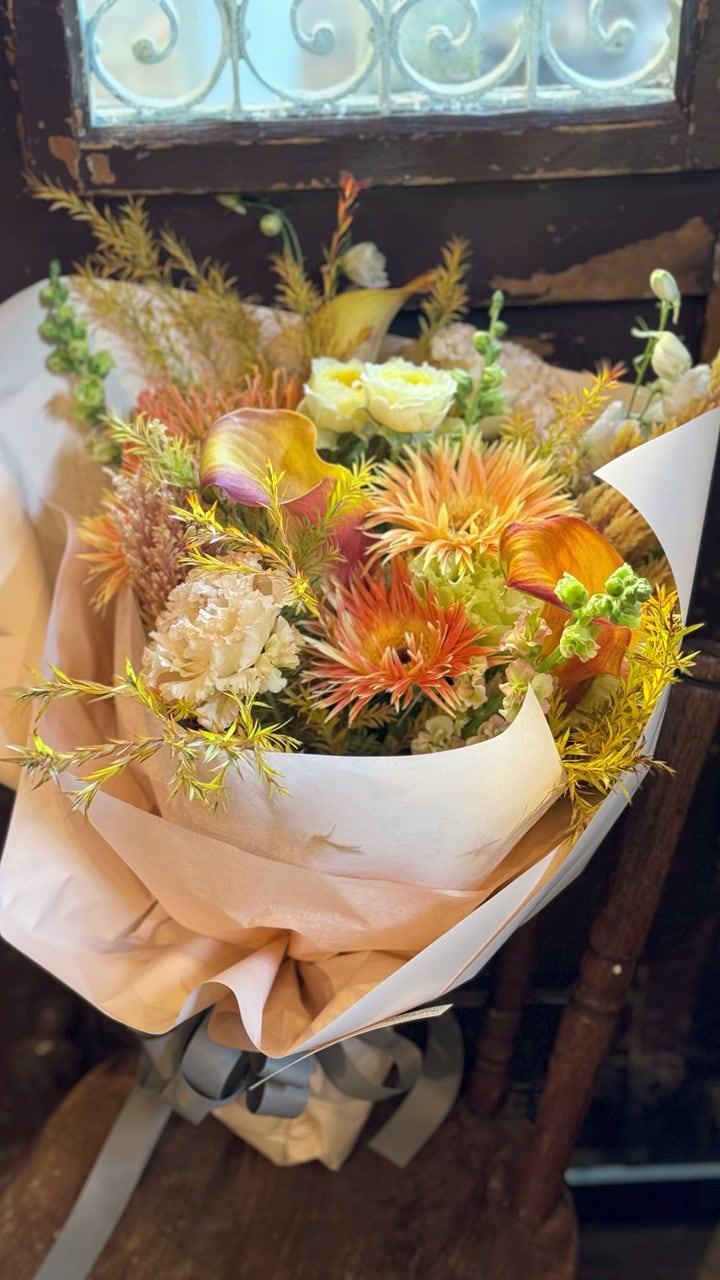 ◎ 思わず笑顔になれるような心温まる色合いのブーケです。さまざまな質感の花材を合わせて豊かさを表現します。