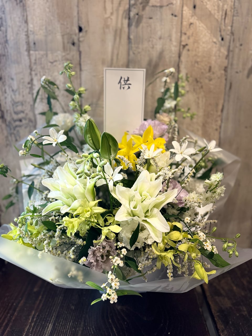 ◎ 白を基調とした花々に、やさしいグリーン、イエロー、パープルを添えて仕立てたお悔みのアレンジメントです。清らかな百合を中心に、静かで穏やかな佇まいになるよう全体のバランスを大切にまとめました。