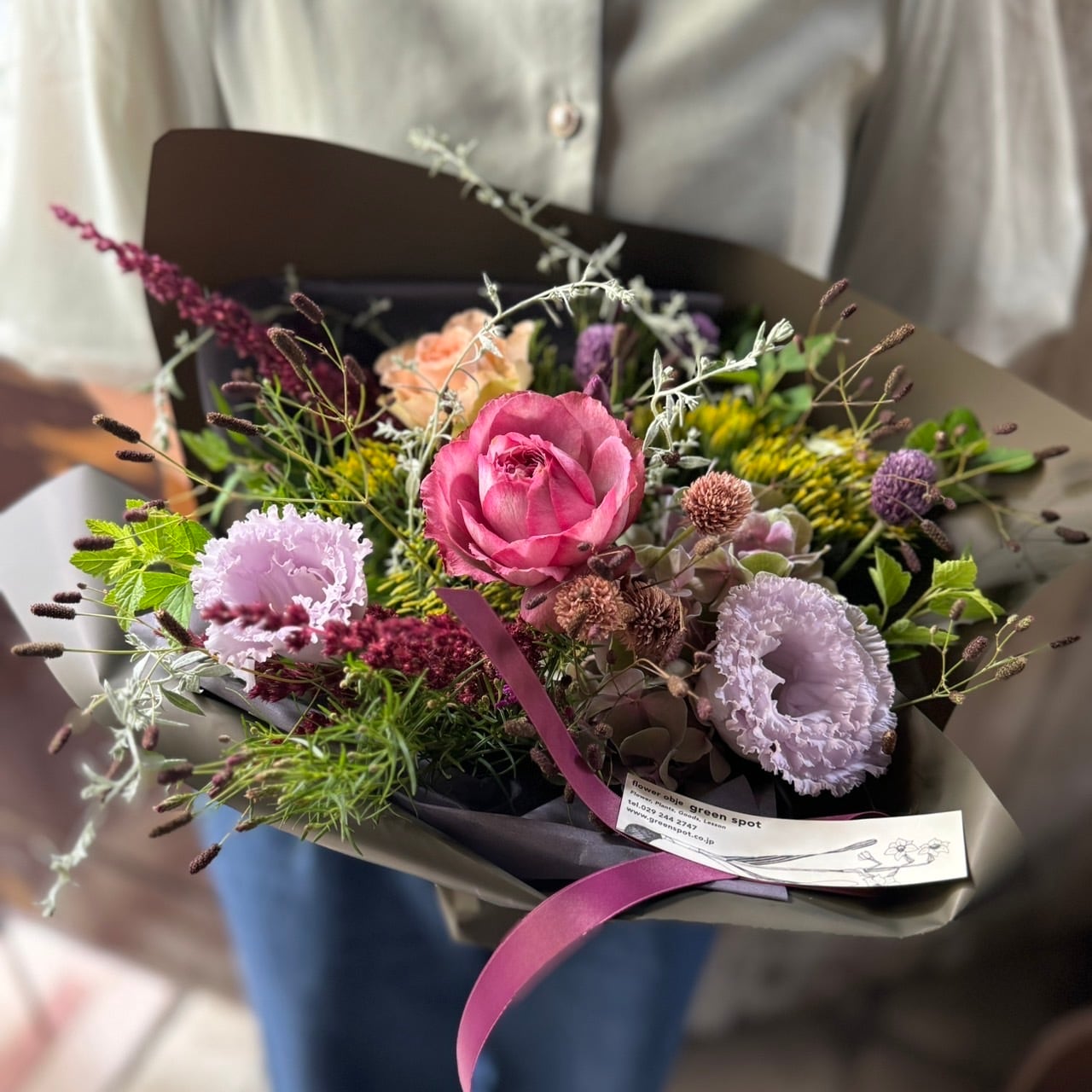 ◎ シックな色合いのアレンジメントです。はっきりした色も使うので、男性の方へのギフトとしてもおすすめです。グリーンスポットが得意とする動きのあるグリーンを合わせておしゃれなデザインでお作りいたします。