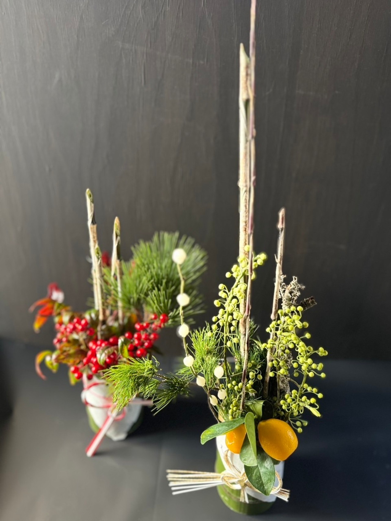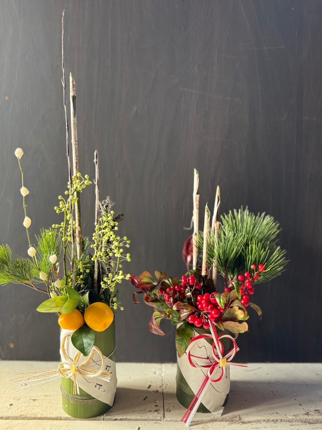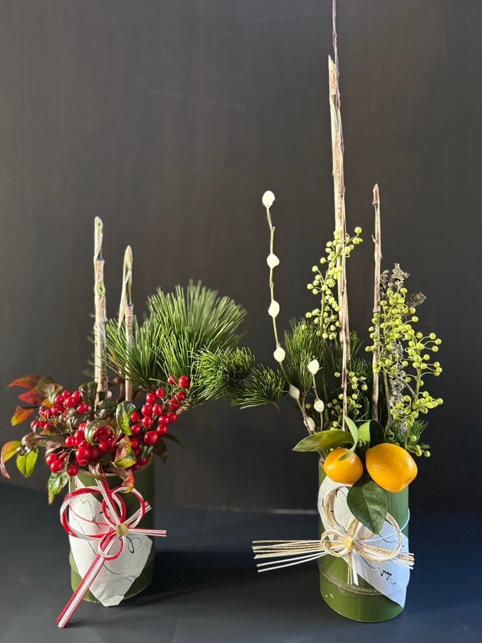 ◎ 青竹の器に寒竹、松、天実、金柑などのおめでたい花材を使った門松アレンジ(2個セット)です。ご自宅用にもお年賀にも大変喜んでいただいています。新しい年が良い一年になるよう願いを込めてお届けします。